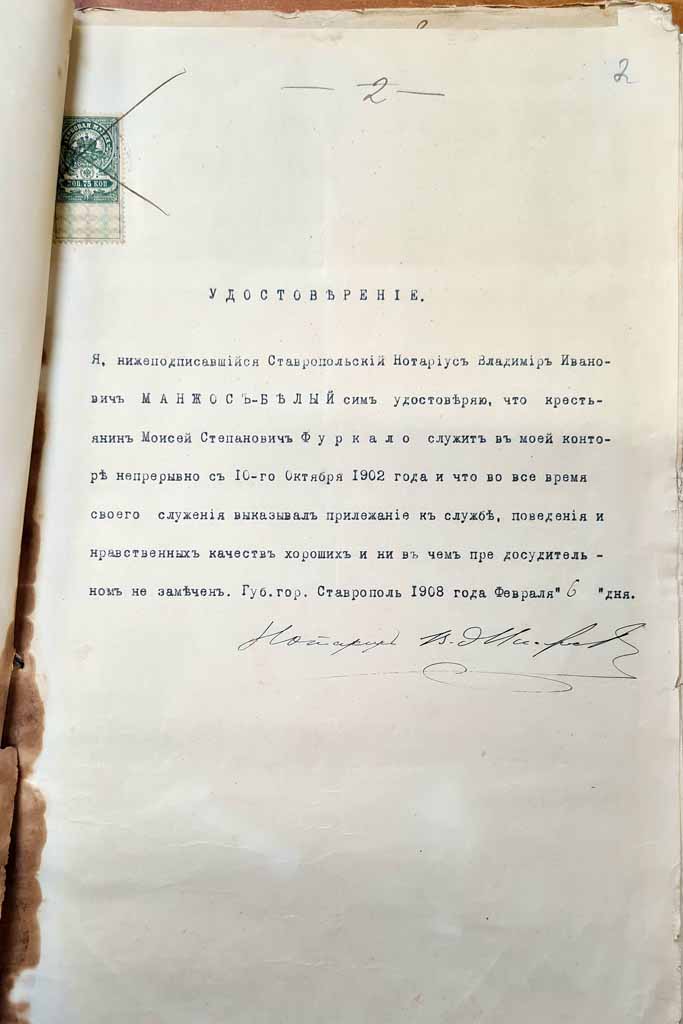 Прочла статью праправнучка нотариуса села Александровского Ставропольской губернии Моисея Степановича Фуркало. Зовут ее Алиса Петрова, к юридической профессии она отношения не имеет, да и живет в Ростове-на Дону. Роднит ее с нами интерес к своим корням и бережное отношение к истории.